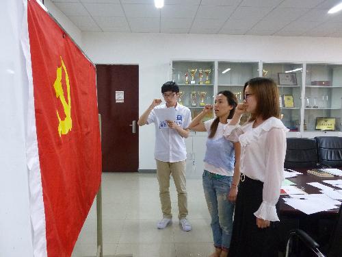 大会在雄伟的国际歌声中开幕。会议第一项,首先由卓舜鹏代表支部对李倩倩、申婷两名发展对象在考察期内的表现做简要总结。两名发展对象也依次宣读入党志愿书,表达了积极入党的强烈愿望,且入党介绍人分别阐述介绍人意见。之后,在党支部副书记的组织下,与会党员就两名发展对象是否符合党员标准进行深入讨论,大家积极踊跃发言,民主评议。最后与会正式党员进行不记名投票,最终投票结果显示:李倩倩、申婷两名发展对象的票数均超过半数同意,因此大会决定,同意李倩倩、申婷发展为中共预备党员。两名预备党员在庄严的党旗下宣誓,表明她们的决心。